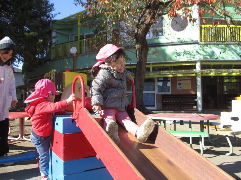 11月21日は寒い日でしたが、天気が良かったのでいちごぐみさんは園庭で巧技台を使って遊びました。