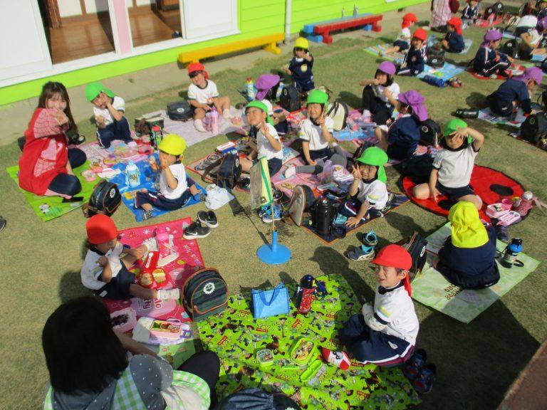 いつもとは違って、園庭で食べるお母さんたちの手作り弁当にみんなニッコニコ♪