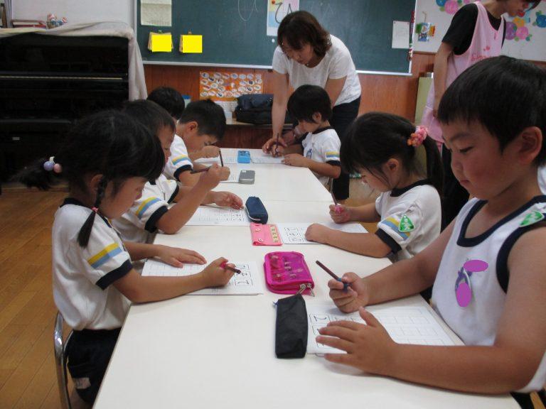 お手本を見ながらそ~っとそ~っと書いている子供たち